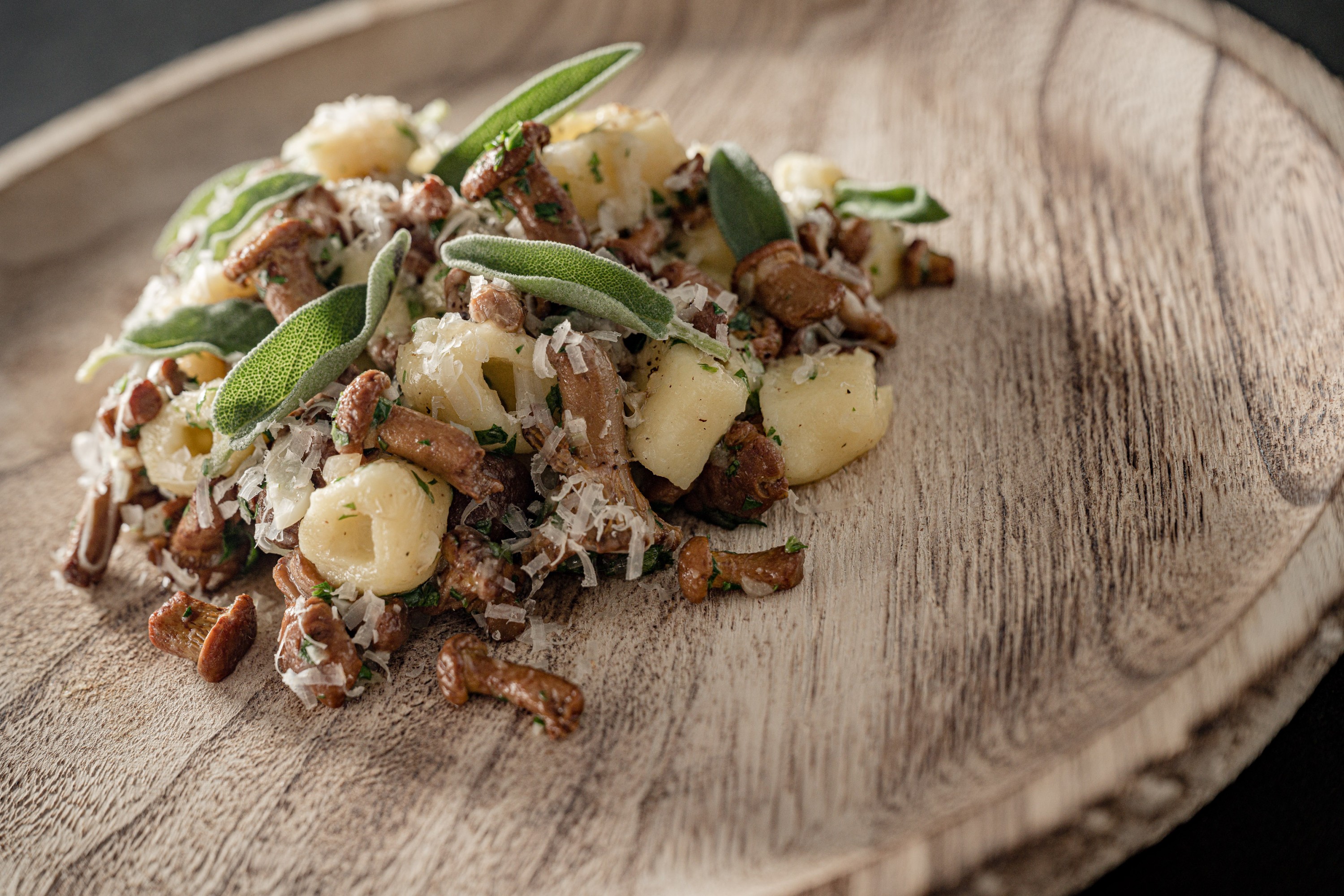 Cuocere gli gnocchi di patate in acqua salata; toglierli con un cucchiaio forato e farli saltare nei finferli. Servire con foglie di salvia, parmigiano e burro.