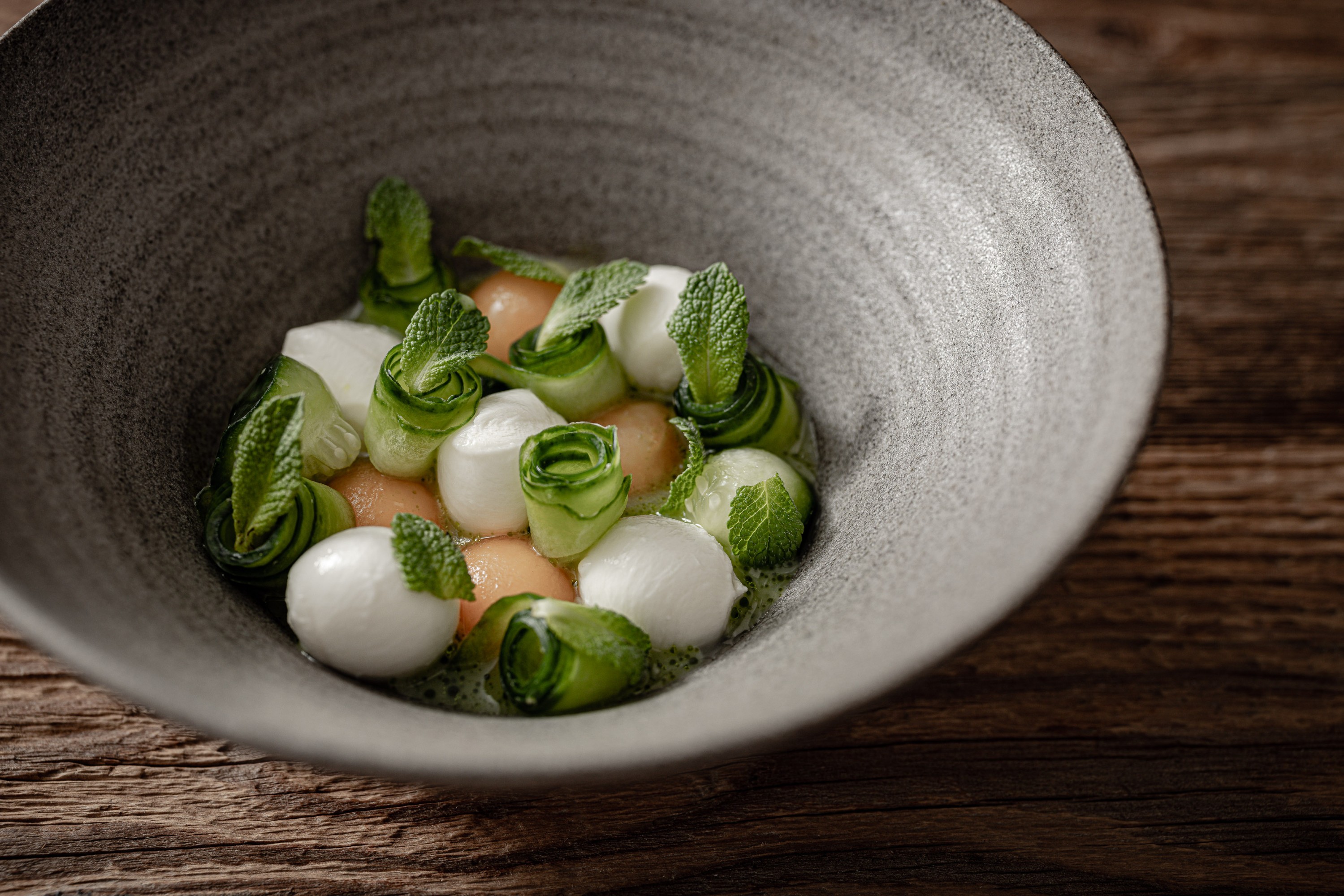 Mozzarelline con melone, cetriolino e sambuco
